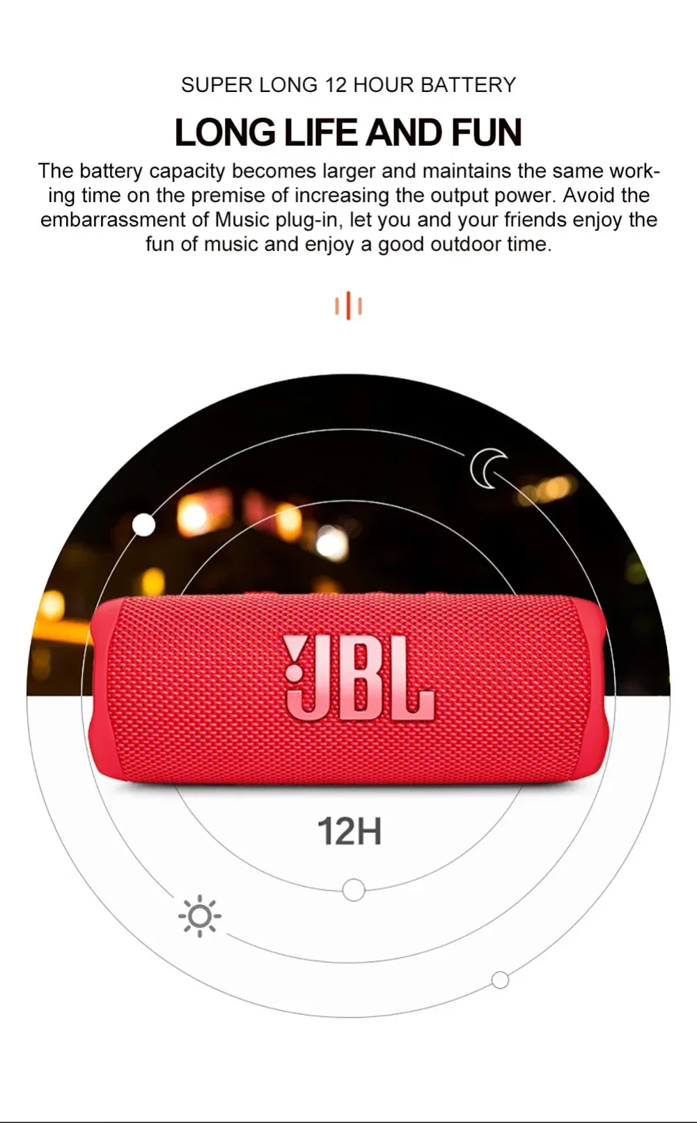 2【15 Hours Playtime】Don’t sweat small things like rechargeable batteries. The JBL Flip 6 gives you up to 12 hours of playback time on a single charge.